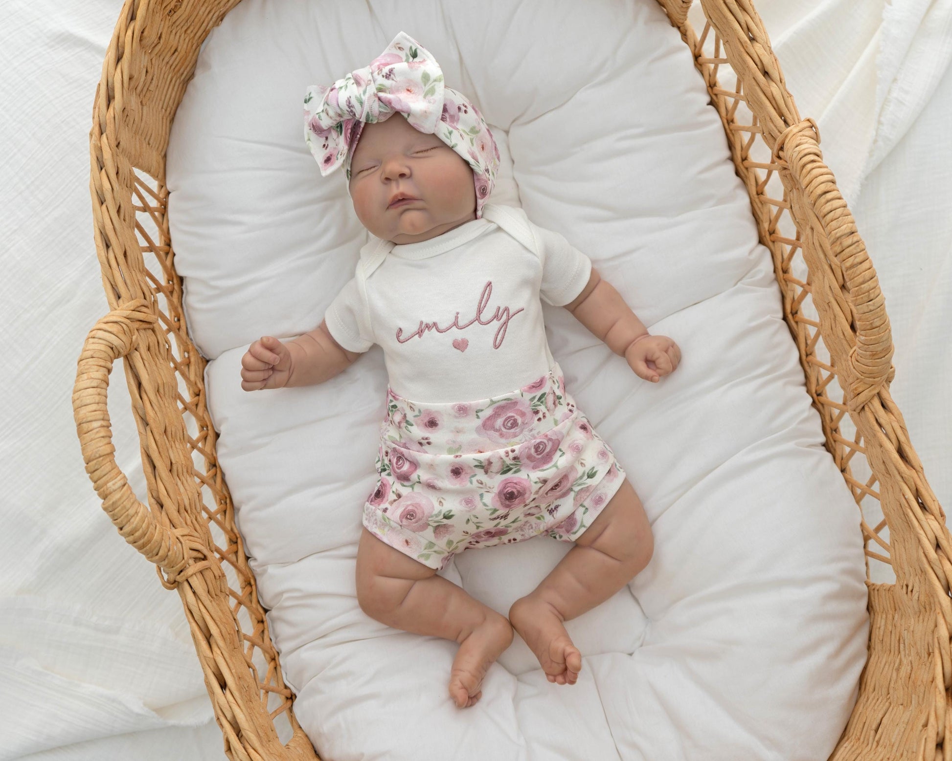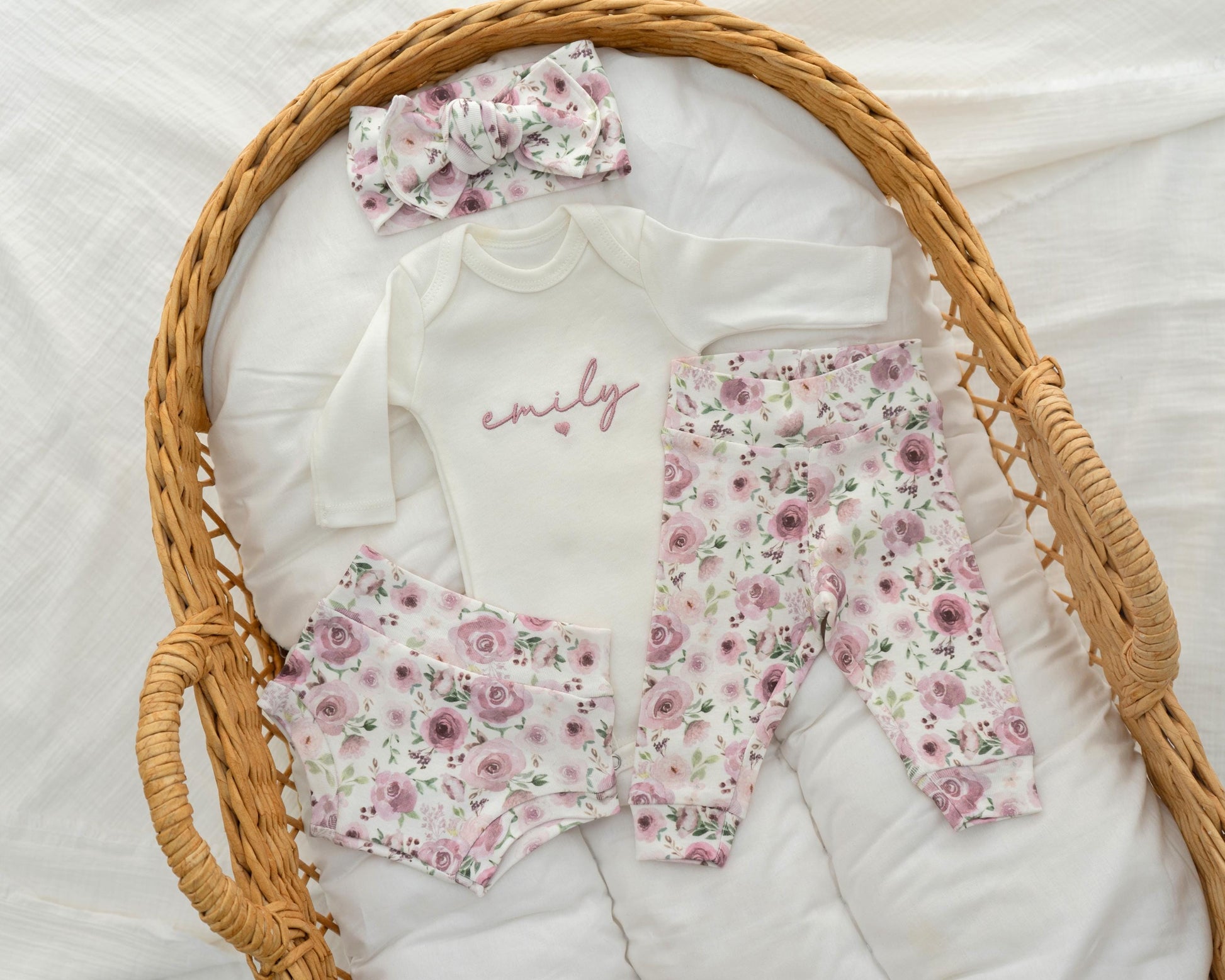 This embroidered newborn baby girl outfit floral is a sweet and thoughtful choice for welcoming your little girl. Ideal as a going home outfit, hospital outfit, or a personalized baby gift, it features delicate embroidery with your baby’s name, and a soft newborn bow for a charming touch.